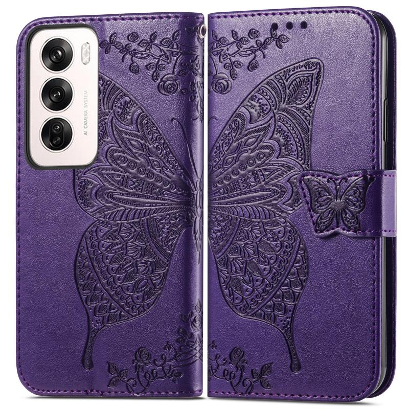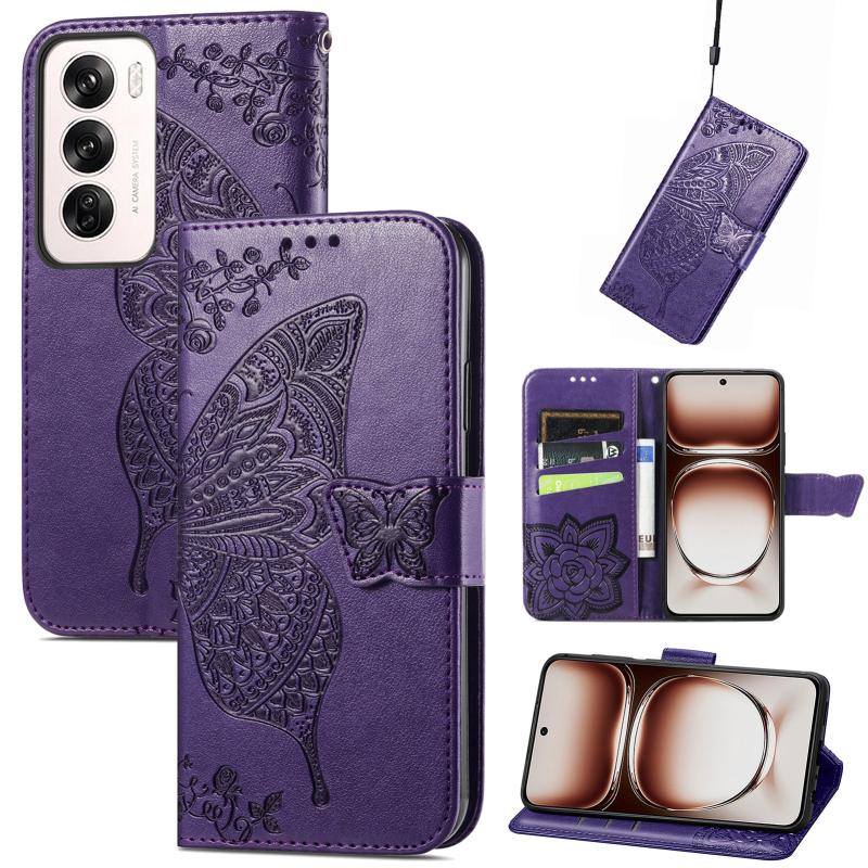 For OPPO Reno12 Pro Global Butterfly Love Flower Embossed Leather Phone Case(Dark Purple)