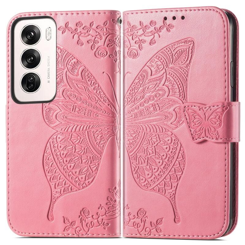 Θήκη τηλεφώνου από δέρμα με ανάγλυφο σχέδιο πεταλούδας και λουλουδιών για OPPO Reno12 Pro Global (Σκούρο Μωβ)