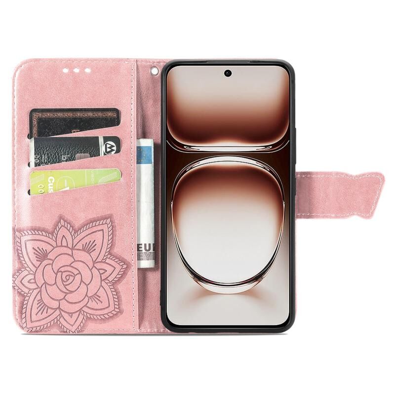 Θήκη τηλεφώνου από δέρμα με ανάγλυφο σχέδιο πεταλούδας και λουλουδιών για OPPO Reno12 Pro Global (Ροζ χρυσός)