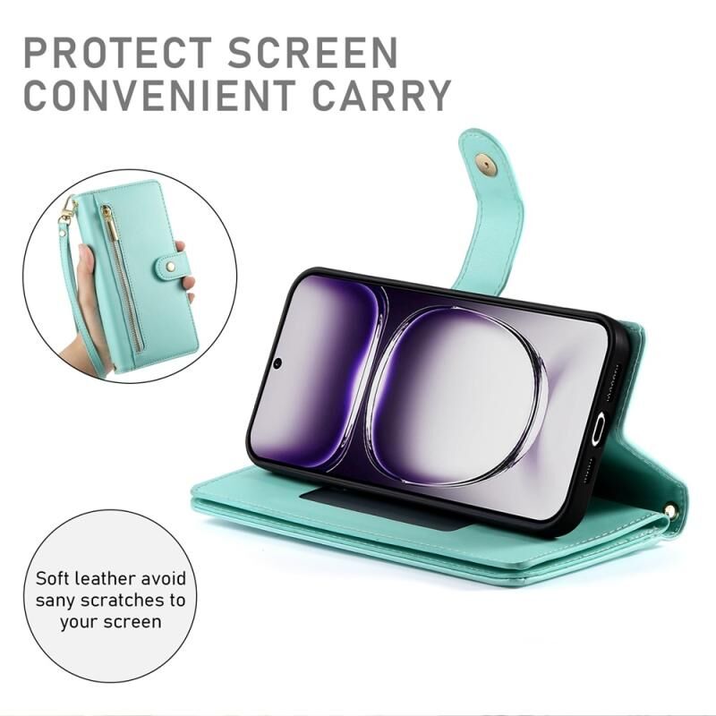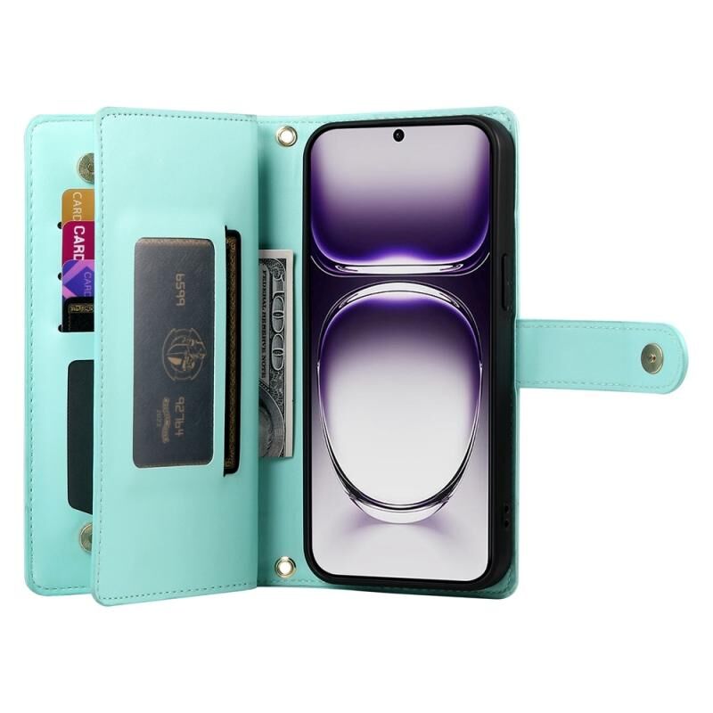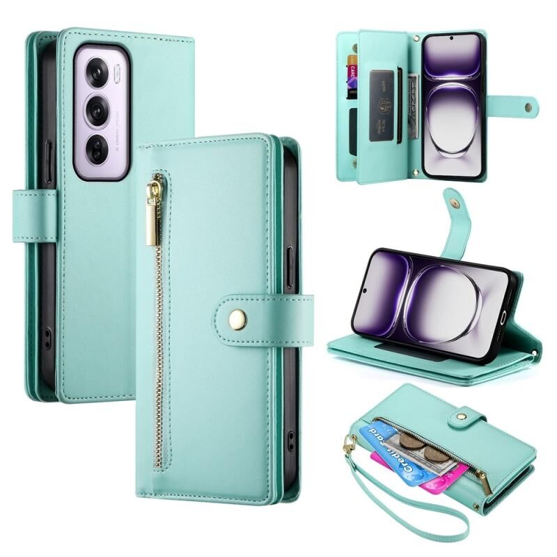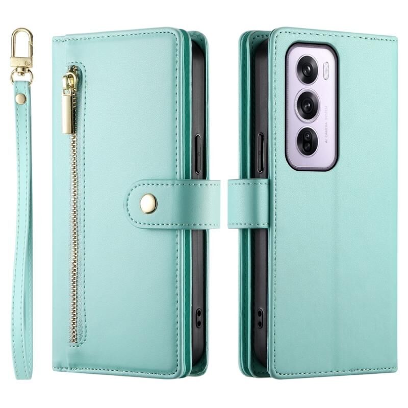 Για OPPO Reno12 Pro Global Nine Card-slot φερμουάρ πορτοφόλι τσάντα δερμάτινη θήκη τηλεφώνου (πράσινο μέντα)