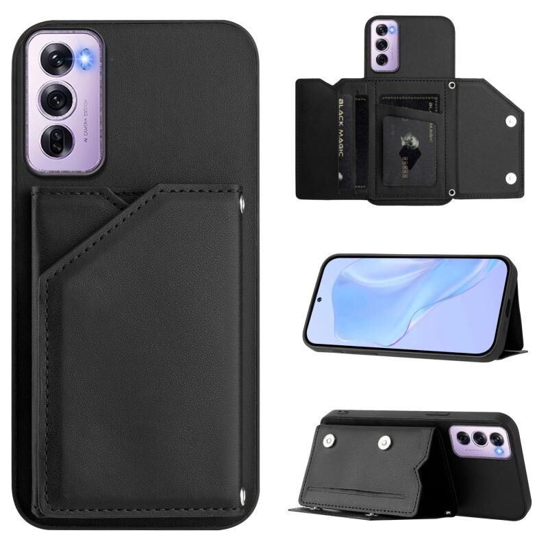 Θήκη τηλεφώνου OPPO Reno12 Pro Global με αίσθηση δέρματος, τέσσερις θήκες καρτών και λουρί καρπού (Μαύρο)