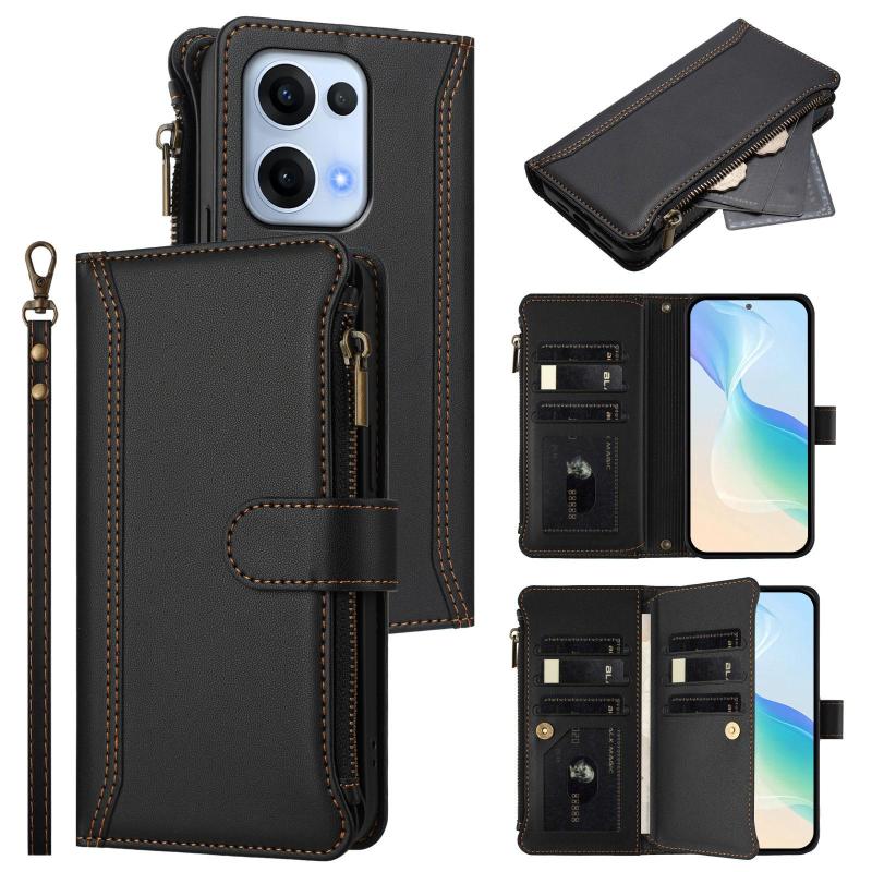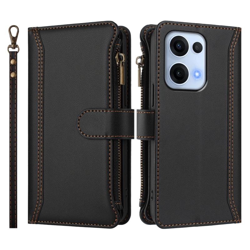 For OPPO Reno13 5G Global Magnetic Closure 9 Card Slots Zipper Leather Case with Hand Strap(Black)