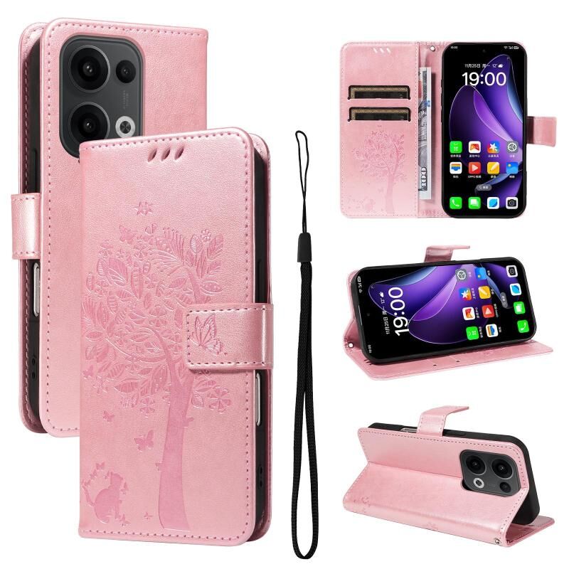 Θήκη τηλεφώνου από δέρμα με σχέδιο ανάγλυφου δέντρου & γάτας για OPPO Reno13 5G (Ροζ)