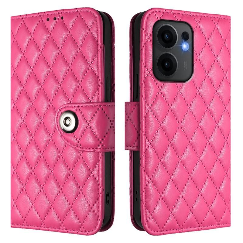 Για OPPO Reno13 F 5G Παγκόσμια Rhombic Υφή Flip δέρμα τηλέφωνο υπόθεση με κορδόνι (Rose Red)