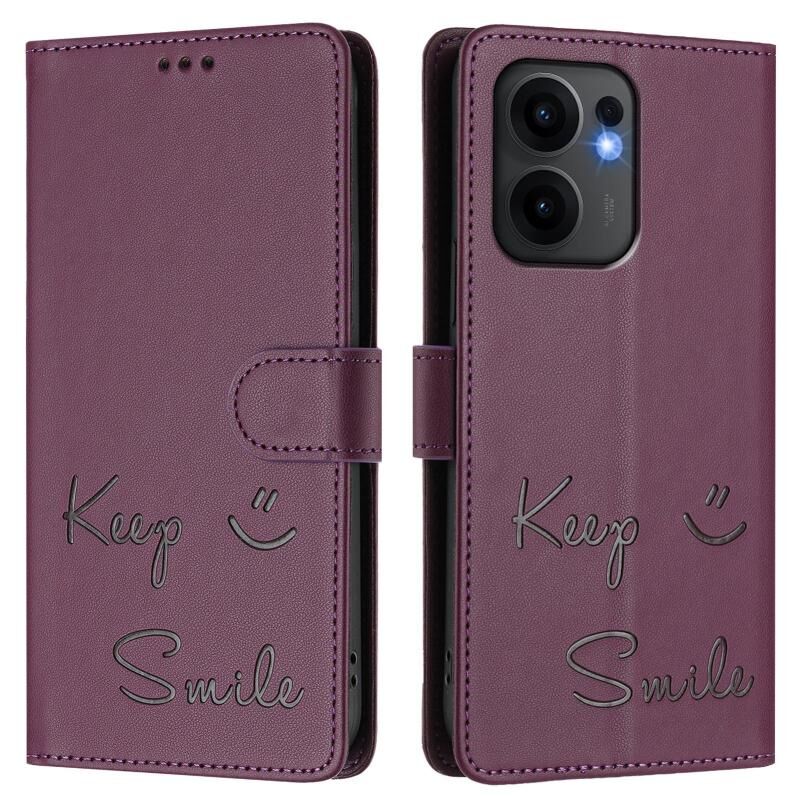 Θήκη τηλεφώνου από δέρμα με ανάγλυφο χαμόγελο και τεχνολογία RFID για OPPO Reno13 F 5G (Μωβ)