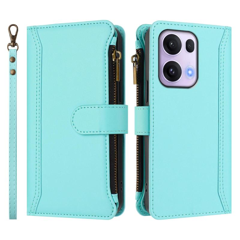 For OPPO Reno13 Pro 5G Global Magnetic Closure 9 Card Slots Zipper Leather Case with Hand Strap(Mint Green)