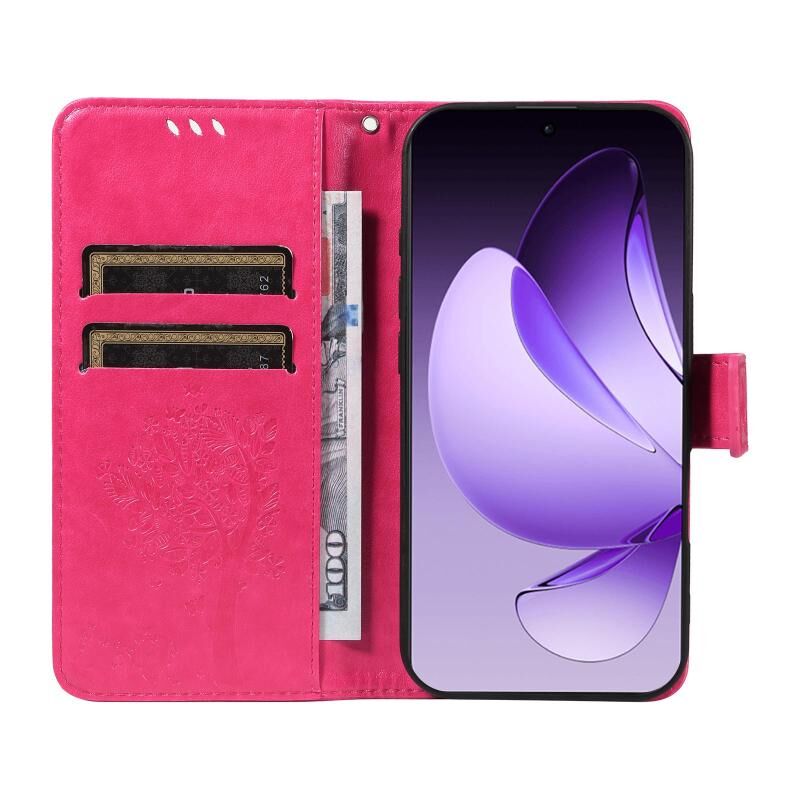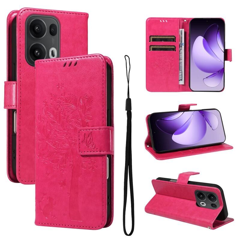 Θήκη τηλεφώνου από δέρμα με σχέδιο αναγλύφου δέντρου & γάτας για OPPO Reno13 Pro 5G (Ροζ)