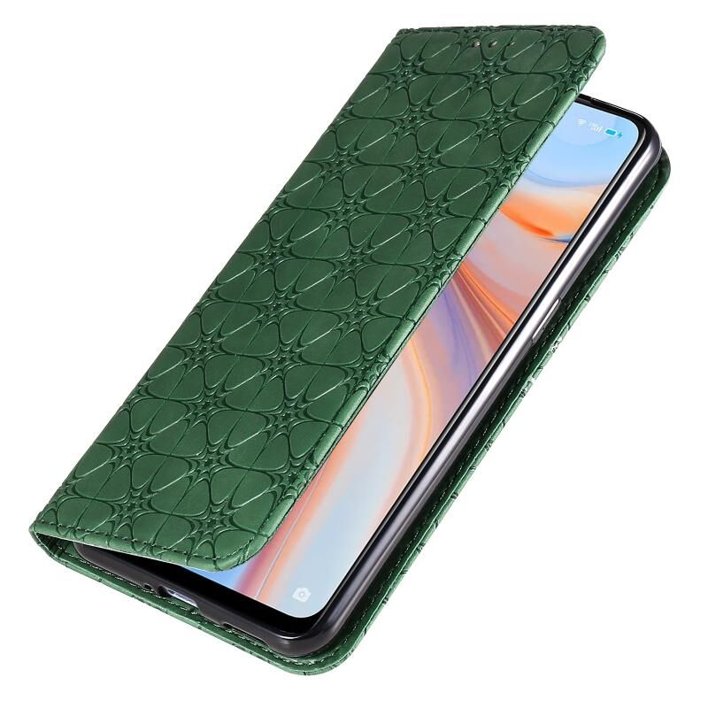 Θήκη δέρματος με μαγνητικό κλείσιμο, οριζόντιας αναδίπλωσης, με ανάγλυφο σχέδιο τυχερών λουλουδιών για OPPO Reno4 5G, με βάση στήριξης & θήκες καρτών (Σκούρο Μπλε)