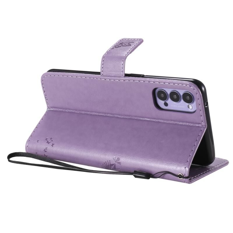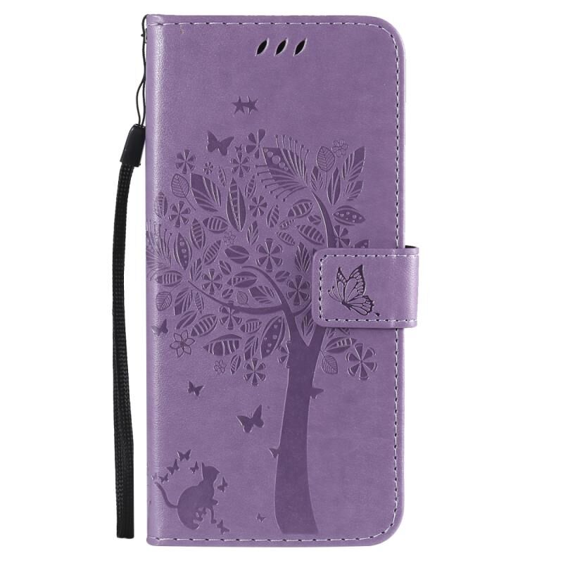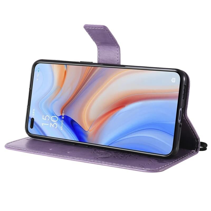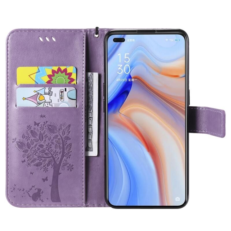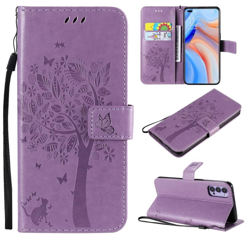 Για Oppo Reno4 5G Θήκη Δέρματος Οριζόντιας Αναδίπλωσης με ανάγλυφο σχέδιο Δέντρου & Γάτας με Στήριξη & Θήκες Καρτών & Πορτοφόλι & Λουρί (ανοιχτό μωβ)