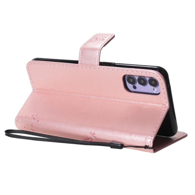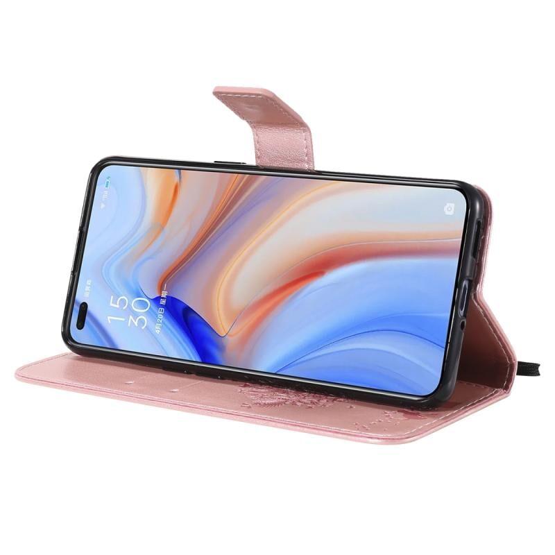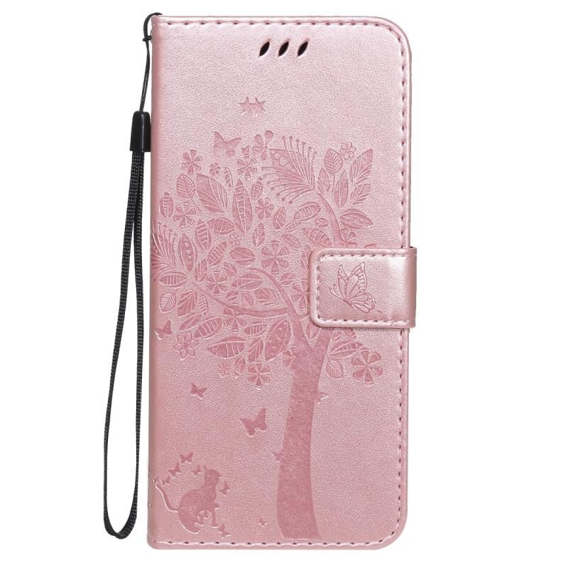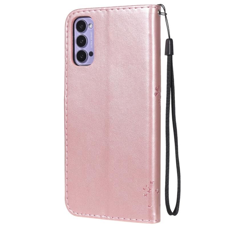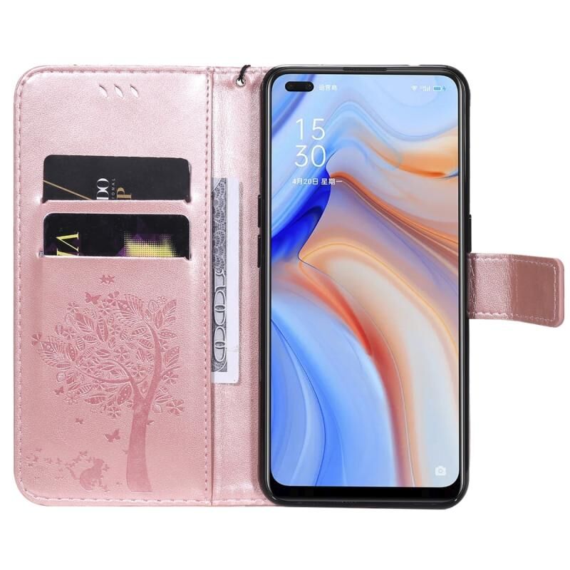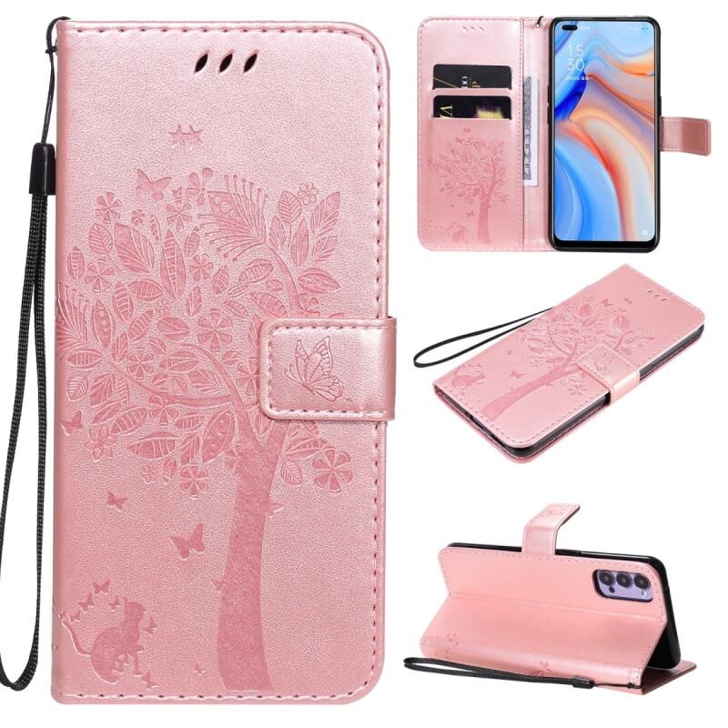 Για Oppo Reno4 5G Θήκη Δέρματος Οριζόντιας Αναδίπλωσης με ανάγλυφο σχέδιο Δέντρου & Γάτας με Στήριξη & Θήκες Καρτών & Πορτοφόλι & Λουρί (Ροζ χρυσός)