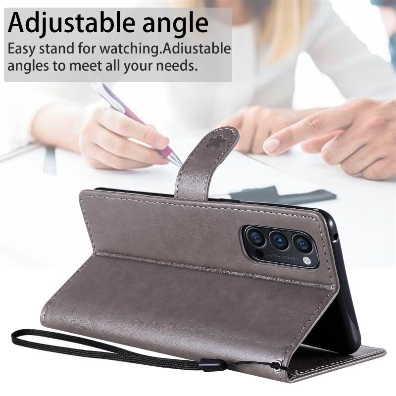 Θήκη δέρματος οριζόντιας αναδίπλωσης με ανάγλυφο σχέδιο Cat Bee, αντικραδασμική για OPPO Reno4 Pro 4G (Ινδική Έκδοση) με βάση & υποδοχές καρτών & πορτοφόλι (Γκρι)