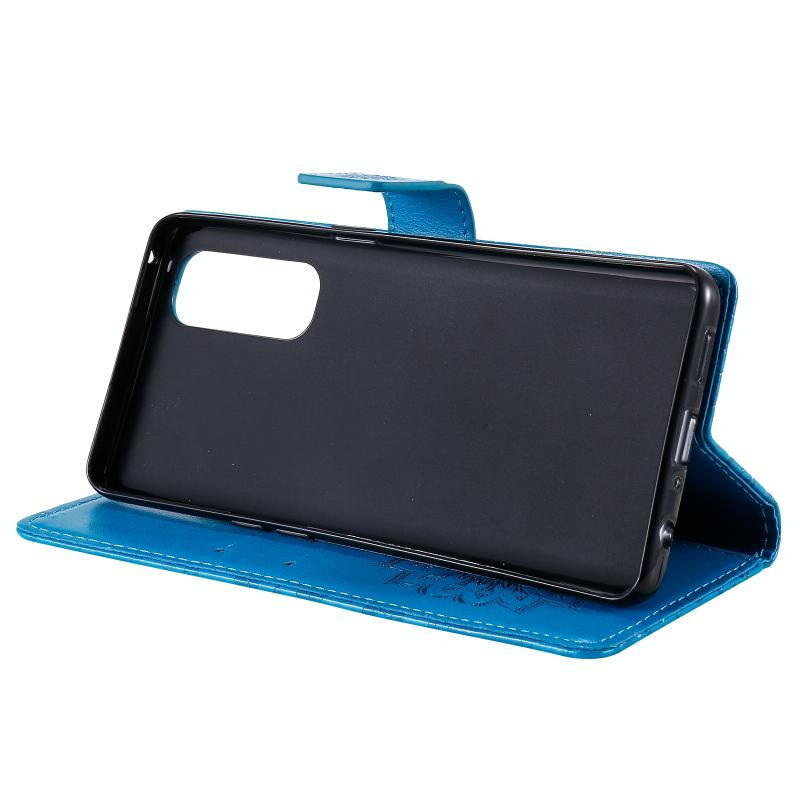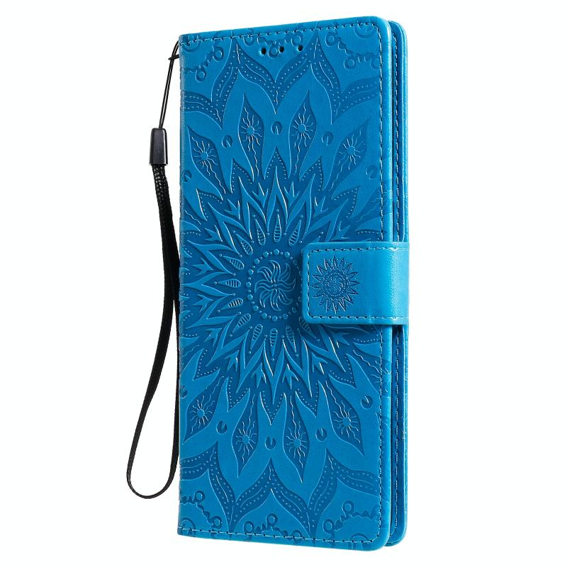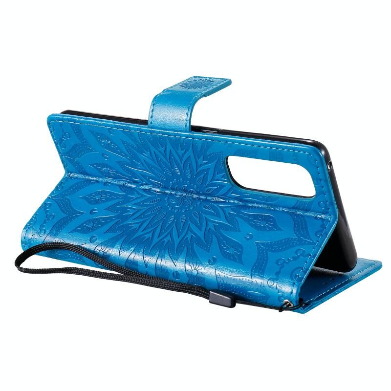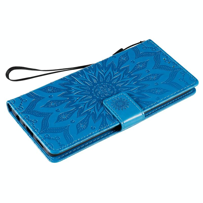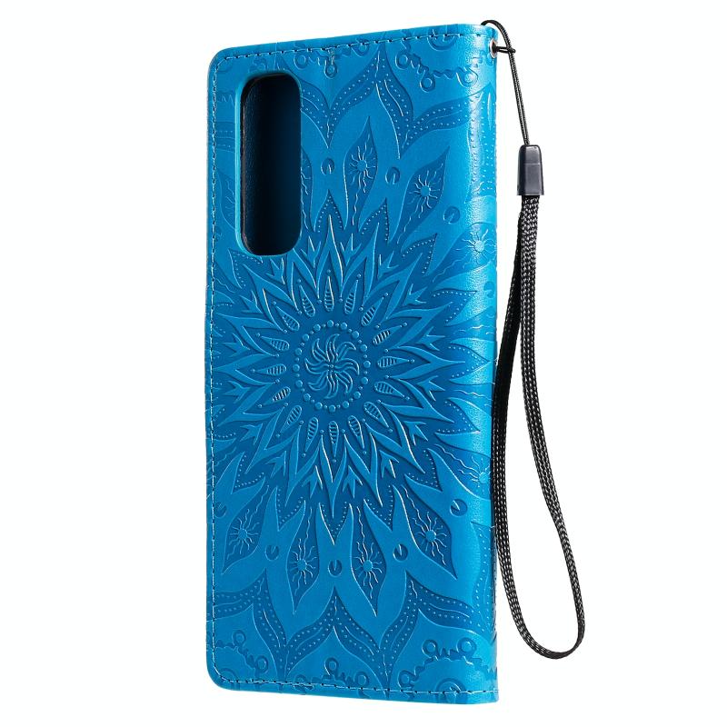 Θήκη δέρματος οριζόντιας αναδίπλωσης για OPPO Reno4 Pro 4G με σχέδιο ηλιακής ανάγλυφης διαμόρφωσης, με υποδοχή κάρτας, βάση στήριξης, πορτοφόλι και κορδόνι (Μπλε)