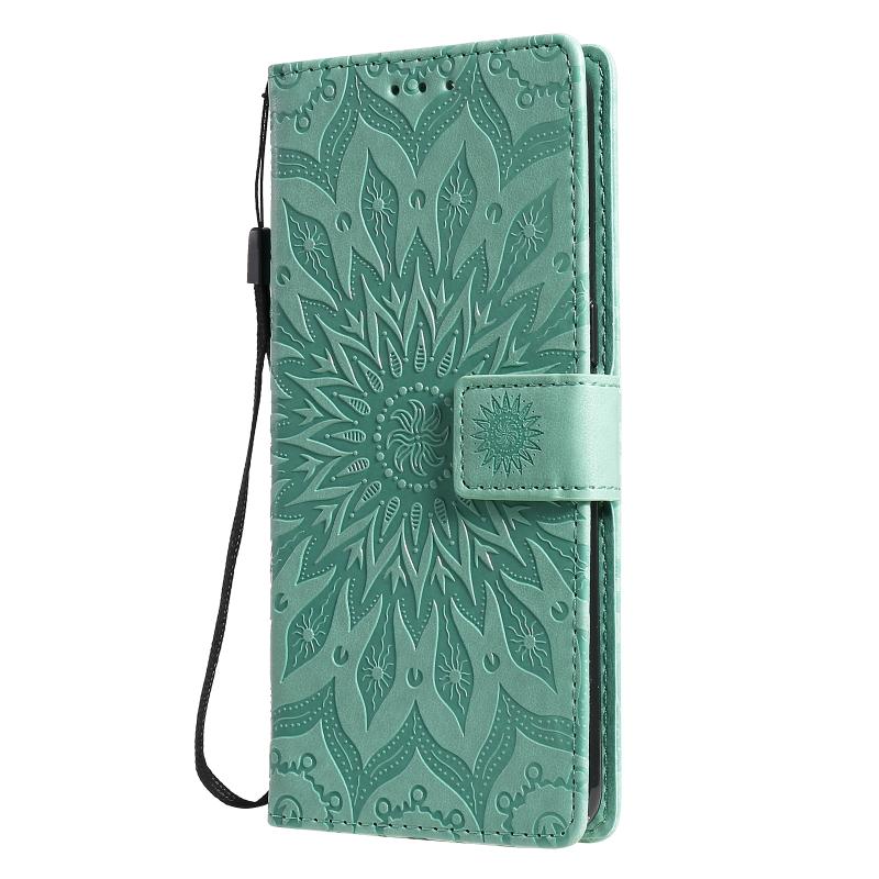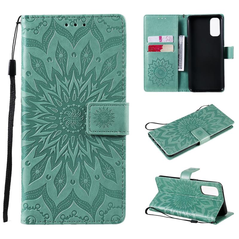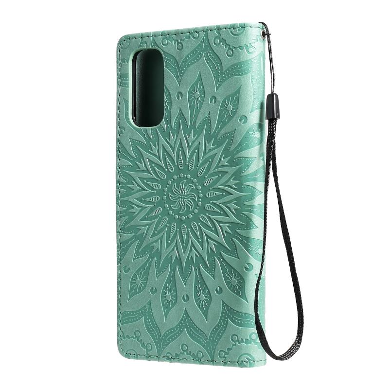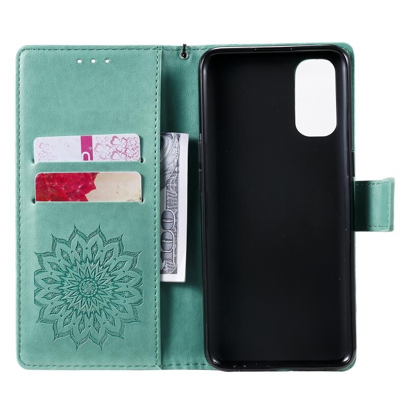 Θήκη δέρματος οριζόντιας αναδίπλωσης για OPPO Reno4 με ανάγλυφο σχέδιο ήλιου, με υποδοχή για κάρτες, βάση στήριξης, πορτοφόλι και λουρί (Καφέ)
