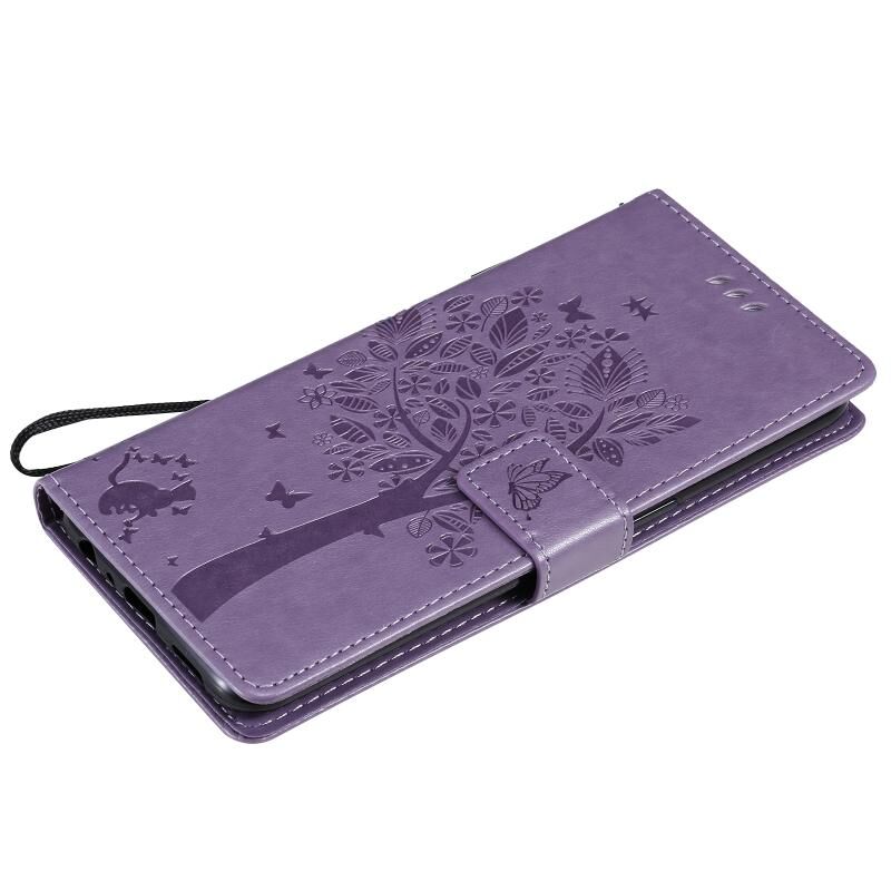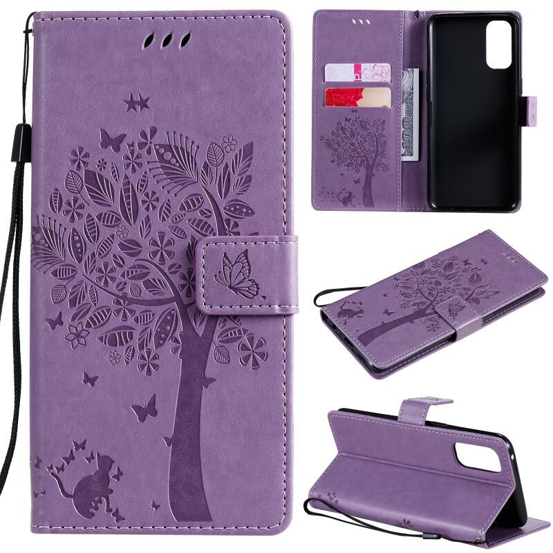 Θήκη για OPPO Reno4 με σχέδιο Δέντρου & Γάτας, με ανάγλυφο τύπωμα, οριζόντια αναδίπλωση, από δερματίνη PU με βάση στήριξης & θήκες για κάρτες & πορτοφόλι & κορδόνι (ανοιχτό μωβ)