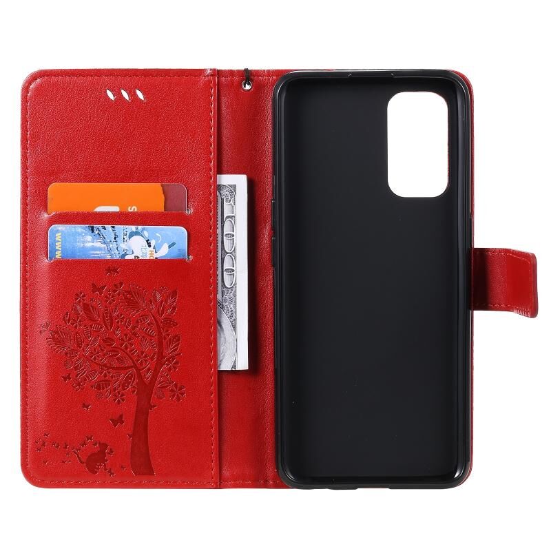 Θήκη για OPPO Reno5 5G με σχέδιο Δέντρου & Γάτας, με εκτύπωση σε ανάγλυφο, οριζόντια αναδίπλωση, από δερματίνη PU με βάση στήριξης & θήκες για κάρτες & πορτοφόλι & κορδόνι (Πράσινο)