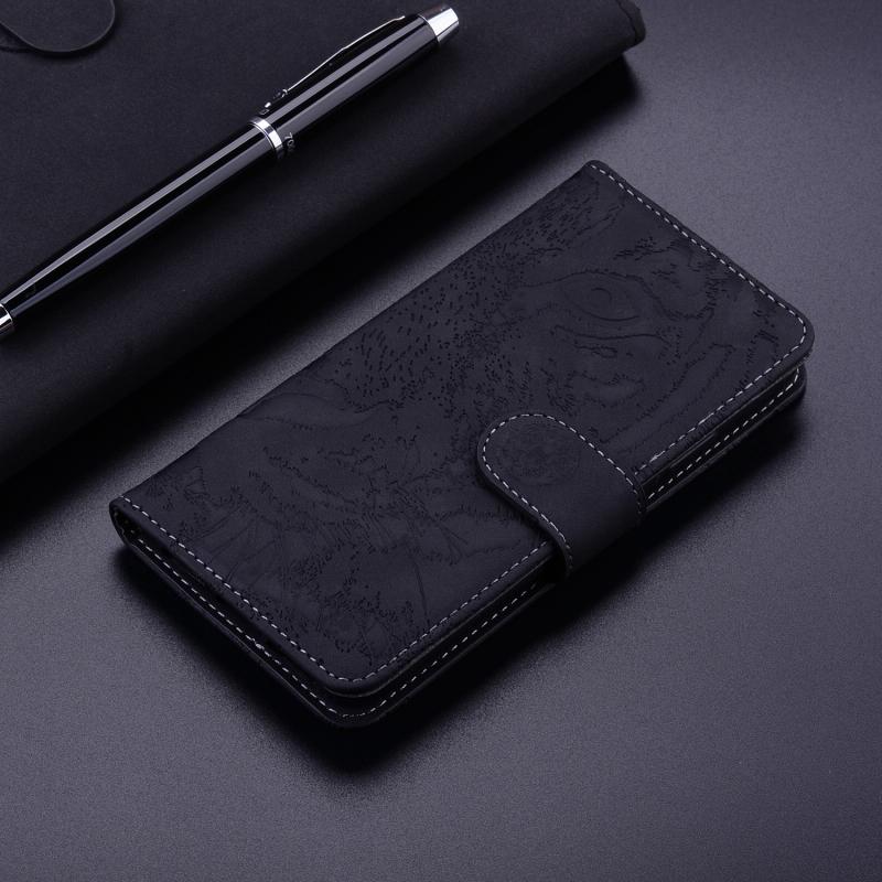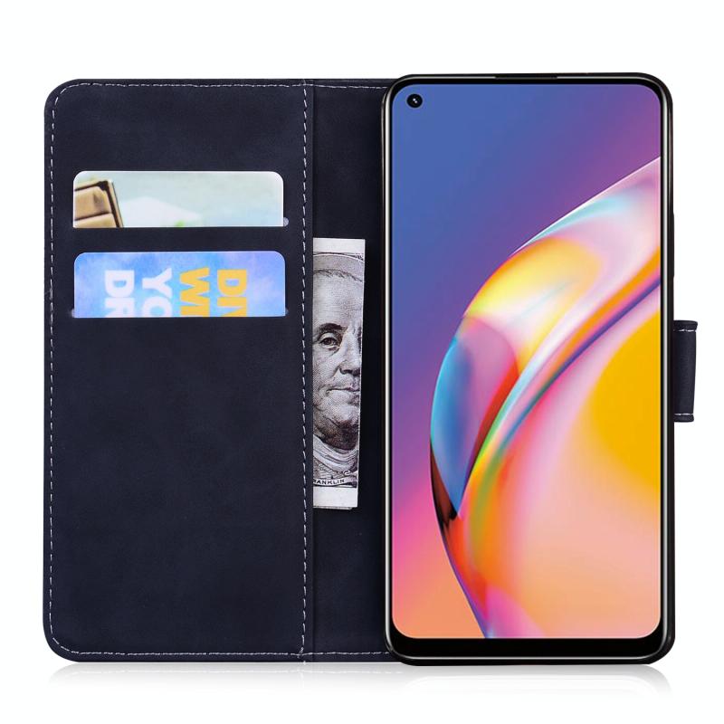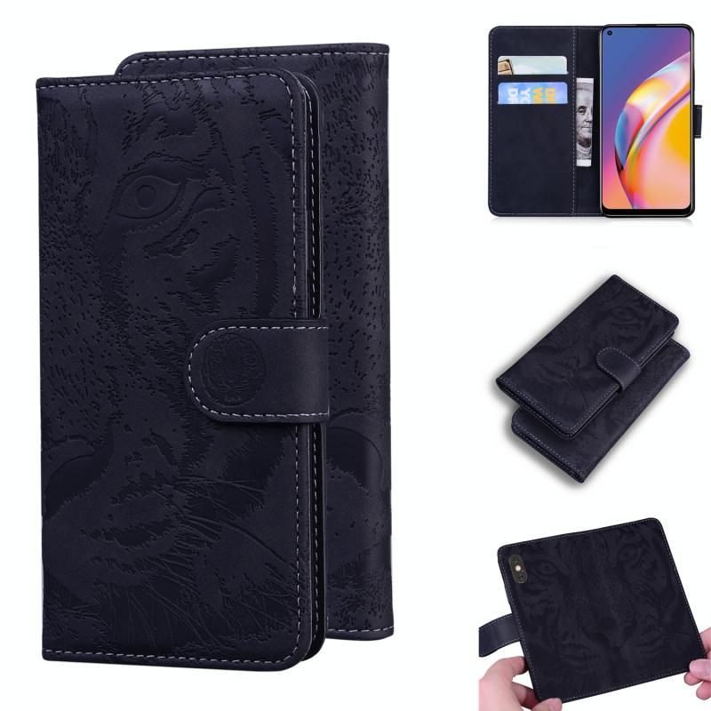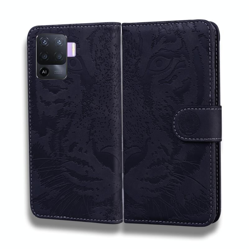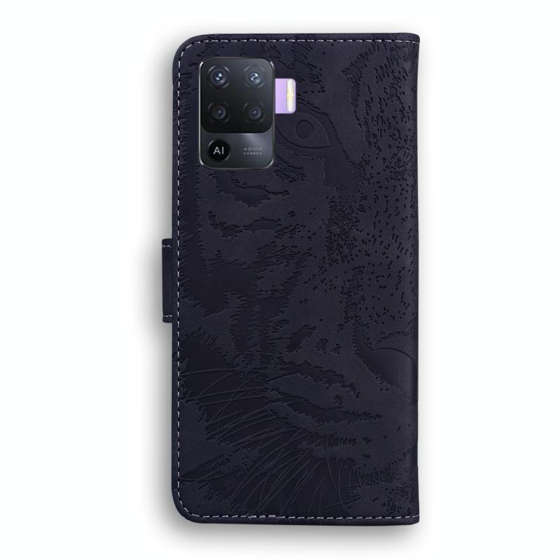 Θήκη δέρματος οριζόντιας αναδίπλωσης για OPPO Reno5 F με ανάγλυφο μοτίβο τίγρης, με βάση στήριξης & υποδοχές καρτών & πορτοφόλι (Μαύρο)