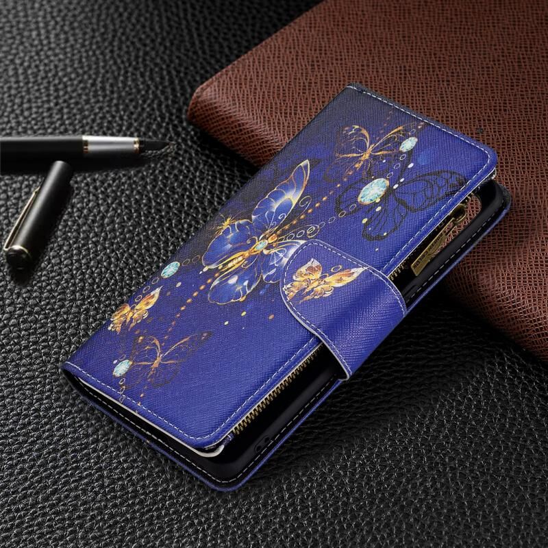 Θήκη δέρματος οριζόντιας αναδίπλωσης με φερμουάρ και σχέδιο πολύχρωμης ζωγραφικής για OPPO Reno5 Pro 5G με βάση στήριξης & υποδοχές καρτών & πορτοφόλι (Μωβ Πεταλούδα)