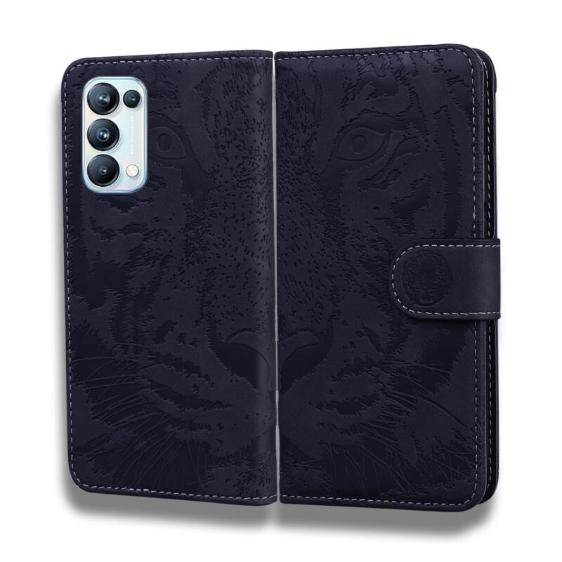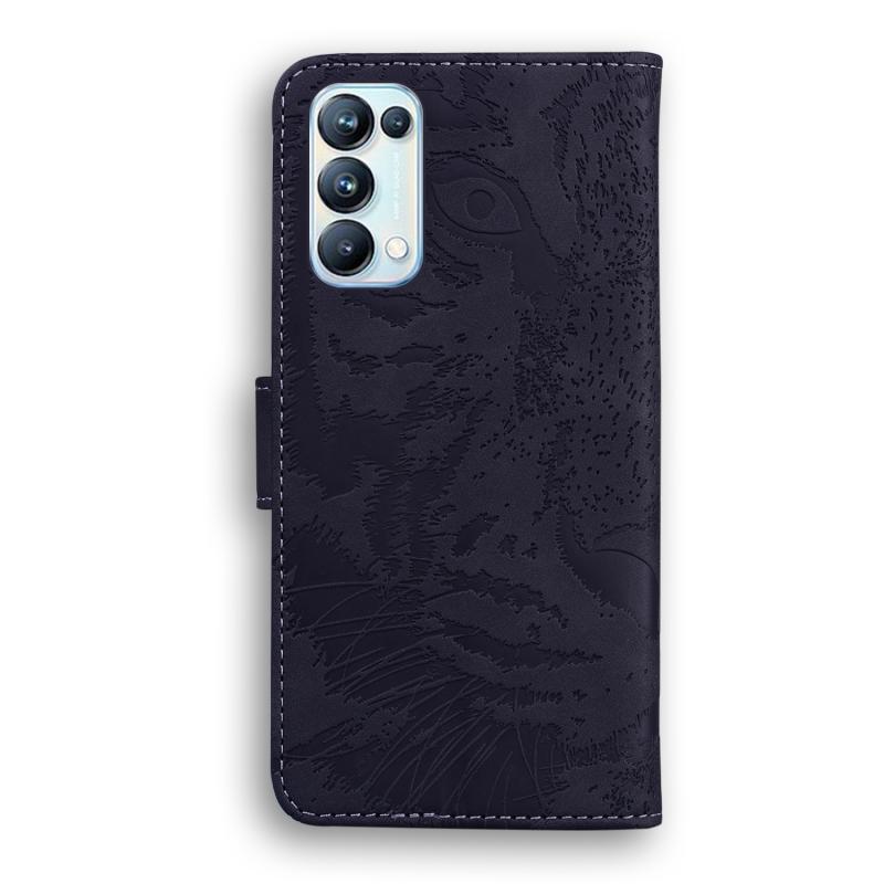 Θήκη δέρματος οριζόντιας αναδίπλωσης για OPPO Reno5 Pro 5G με ανάγλυφο μοτίβο τίγρης, με βάση & υποδοχές καρτών & πορτοφόλι (Μαύρο)