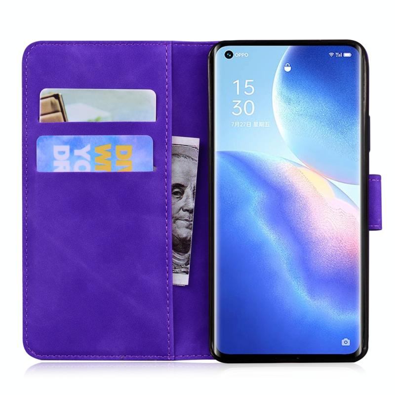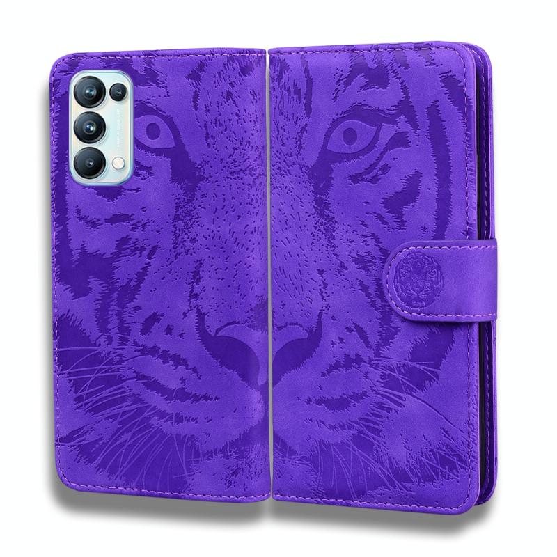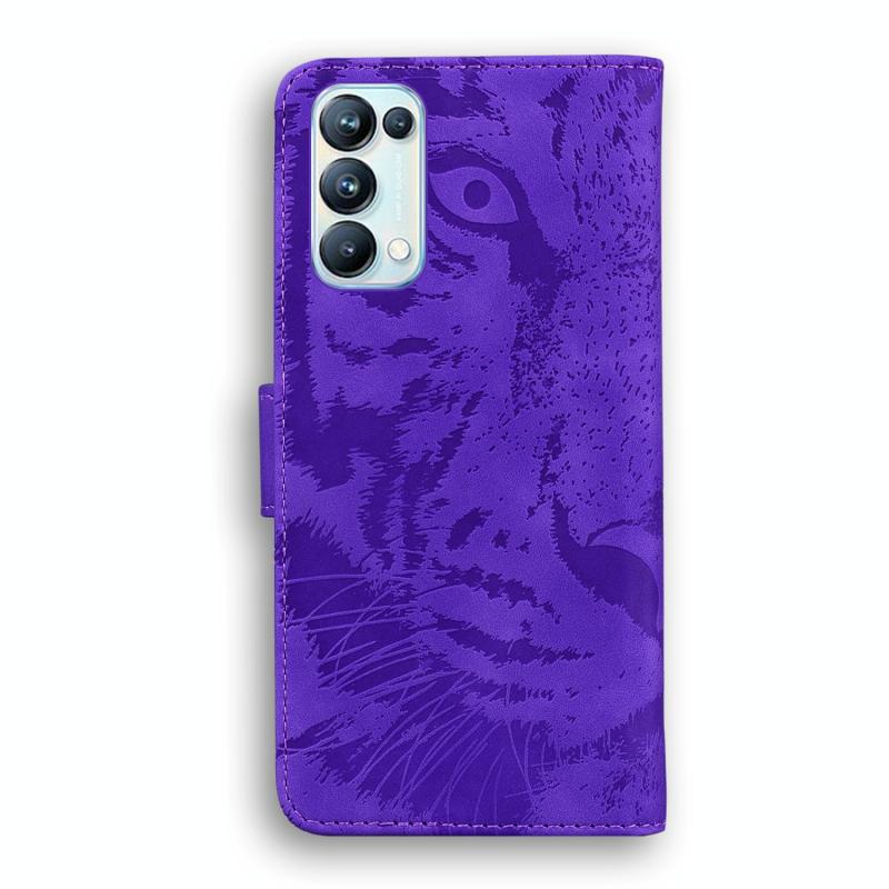 Θήκη δέρματος οριζόντιας αναδίπλωσης για OPPO Reno5 Pro 5G με ανάγλυφο μοτίβο τίγρης, με βάση & υποδοχές καρτών & πορτοφόλι (Μωβ)