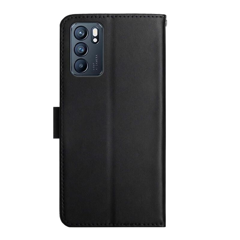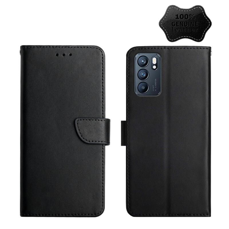 Θήκη τηλεφώνου OPPO Reno6 5G, αυθεντικό δέρμα, ανθεκτική στα δακτυλικά αποτυπώματα, οριζόντια αναδιπλούμενη (Μαύρο)