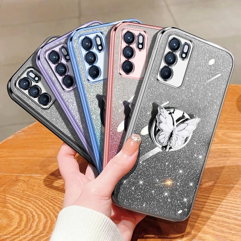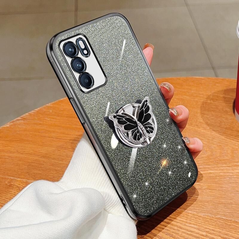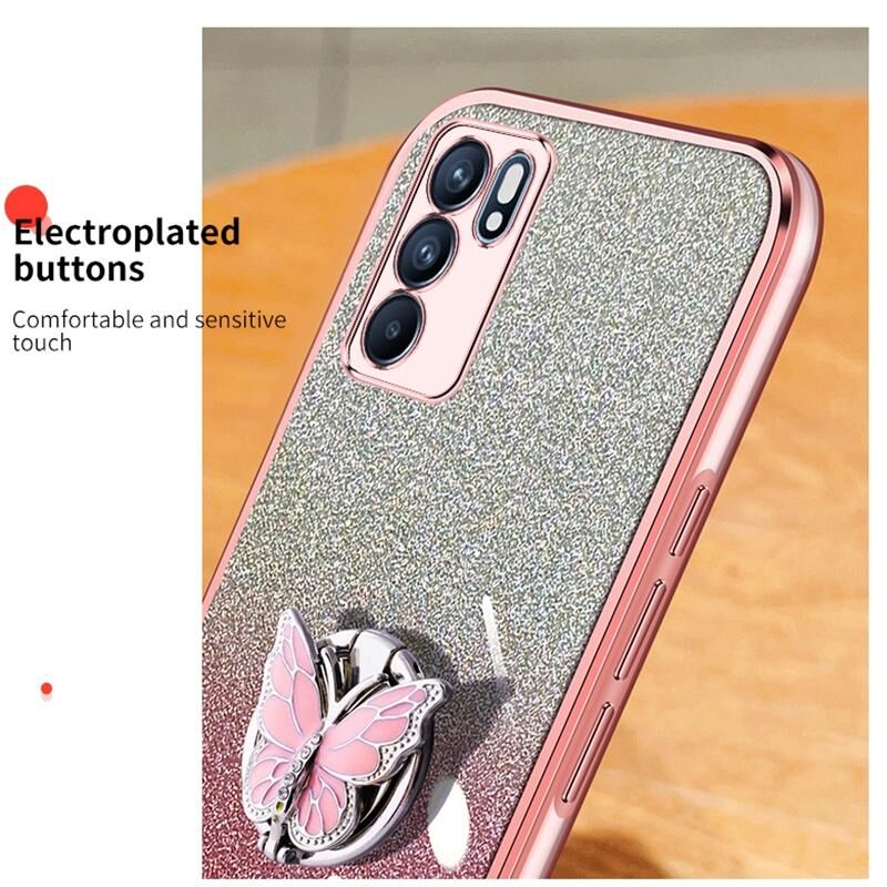 Θήκη κινητού τηλεφώνου OPPO Reno6 5G από TPU με επιμετάλλωση, διαβαθμισμένη λάμψη, σχέδιο πεταλούδας (Ροζ)