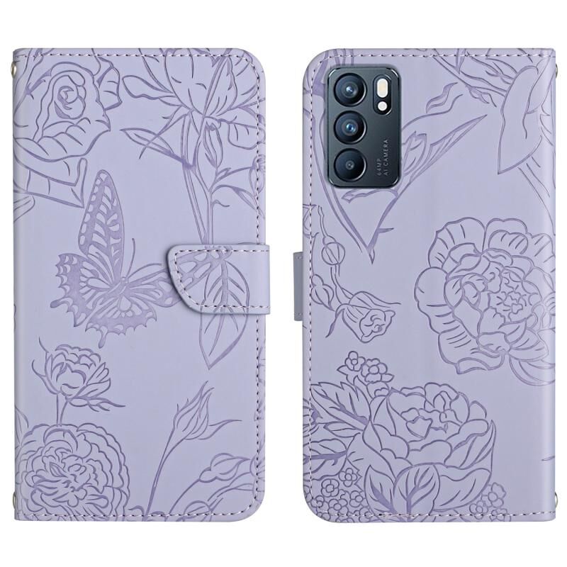 Θήκη τηλεφώνου από δέρμα με ανάγλυφο σχέδιο πεταλούδας και παιωνίας για OPPO Reno6 5G (Κόκκινο)