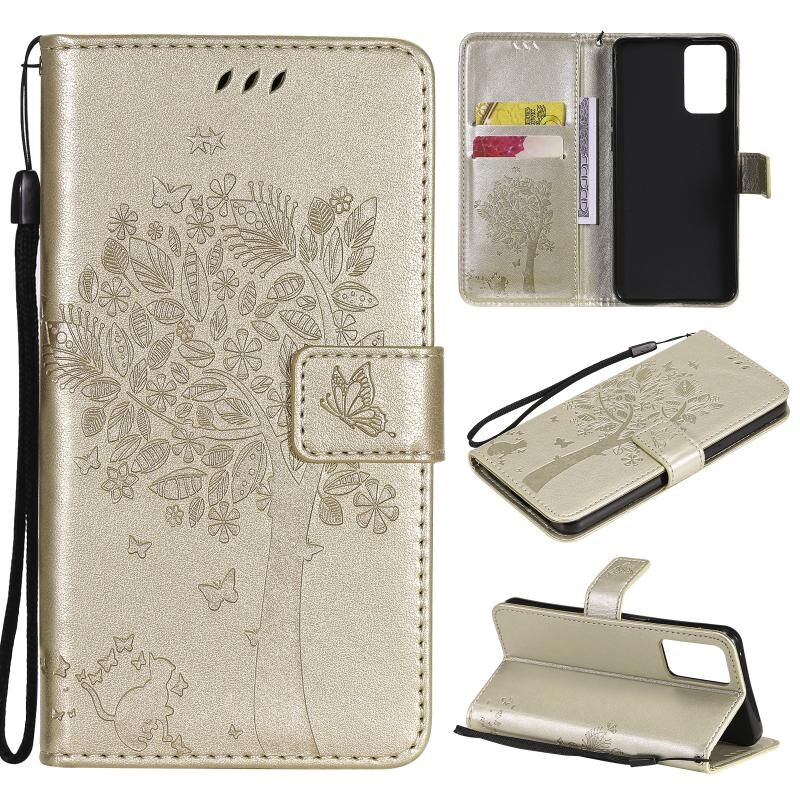 Θήκη για OPPO Reno6 5G με σχέδιο Δέντρου & Γάτας, εκτύπωση με πίεση, οριζόντια αναδίπλωση, από δερματίνη PU με βάση στήριξης & θήκες καρτών & πορτοφόλι & κορδόνι (Ανοιχτό Μωβ)