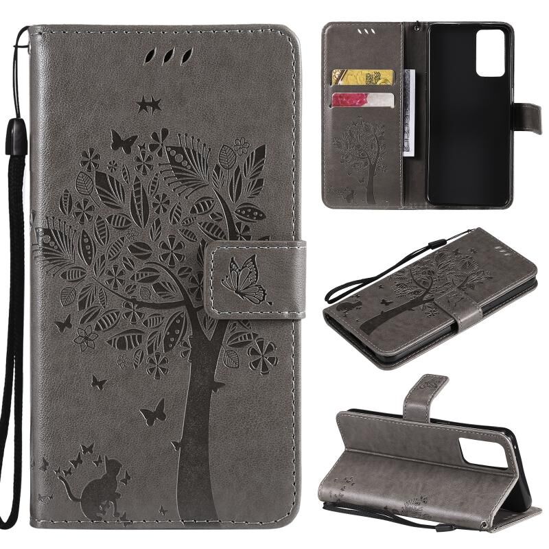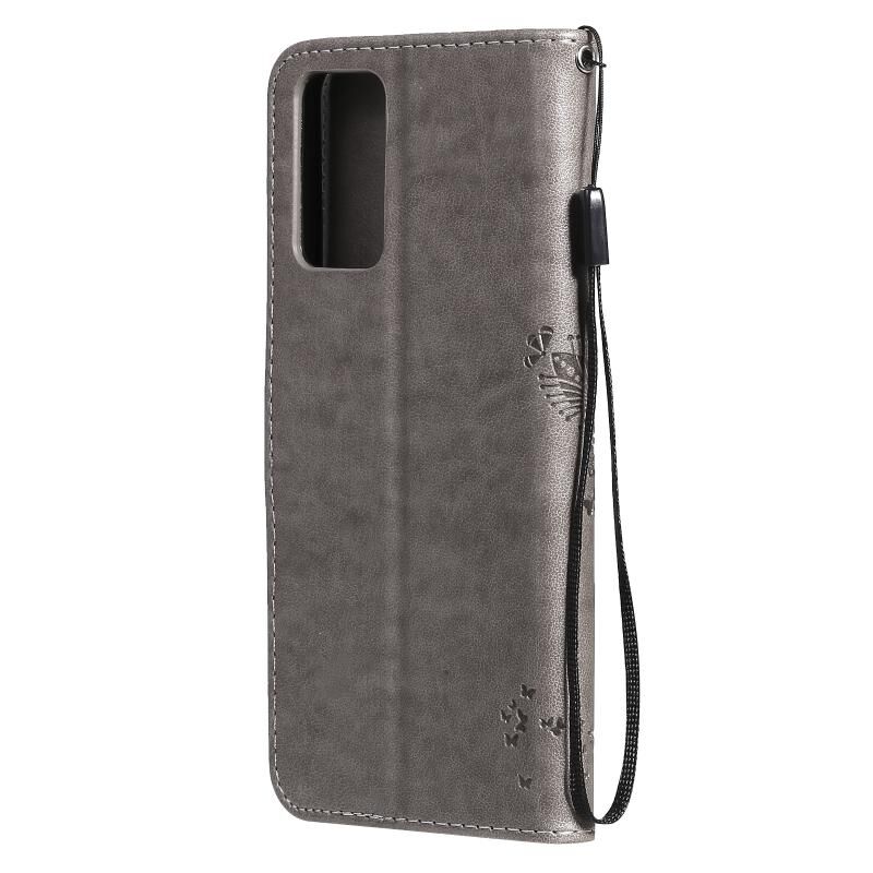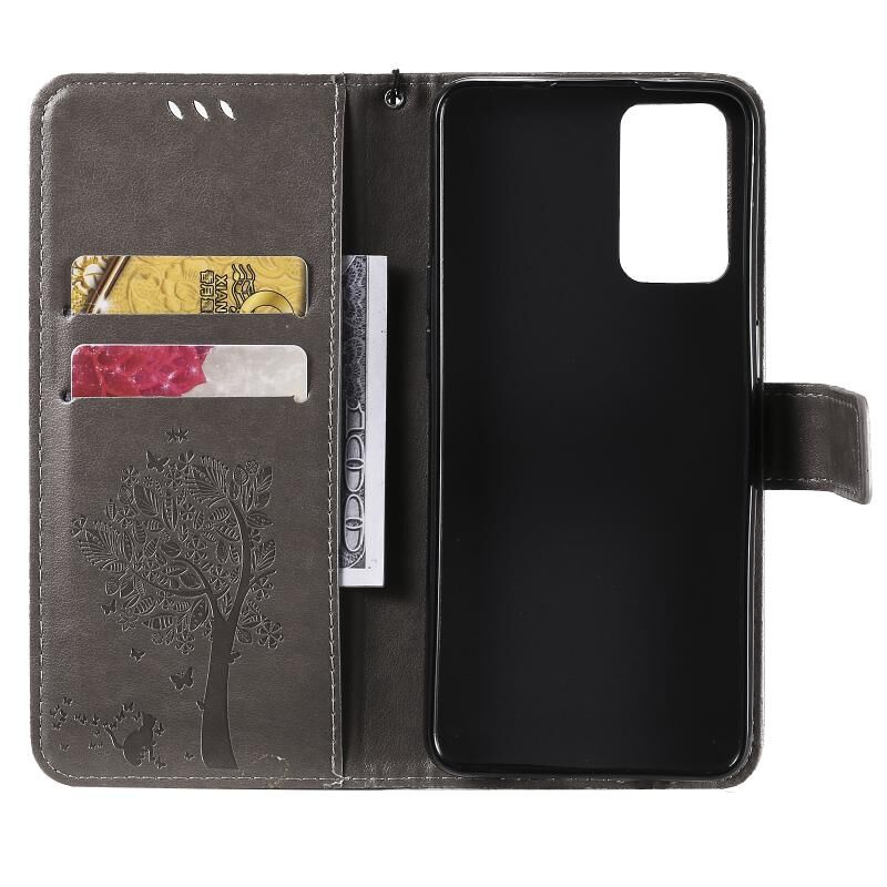 Θήκη για OPPO Reno6 5G με σχέδιο Δέντρου & Γάτας, εκτύπωση με πίεση, οριζόντια αναδίπλωση, από δερματίνη PU με βάση στήριξης & θήκες καρτών & πορτοφόλι & κορδόνι (Ανοιχτό Μωβ)