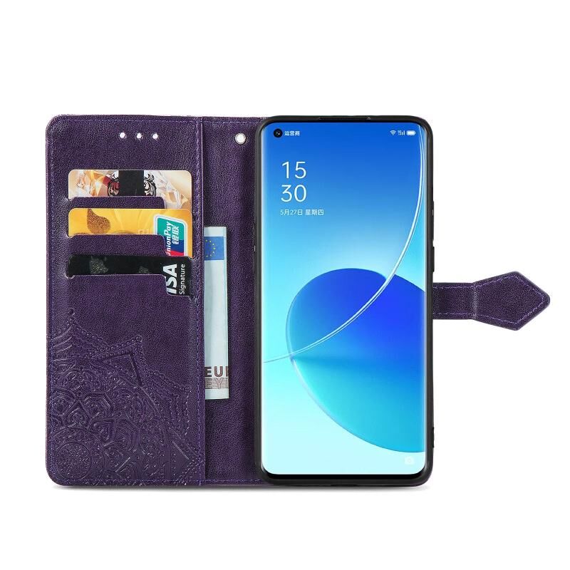 Για OPPO Reno6 Pro + 5G Mandala λουλούδι ανάγλυφο οριζόντια Flip δερμάτινη θήκη με κάτοχο & τρεις υποδοχές για κάρτες & πορτοφόλι & κορδόνι (μωβ)