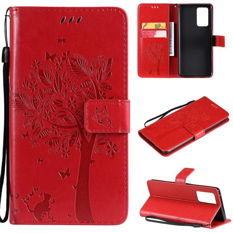 Θήκη για OPPO Reno6 Pro 5G με σχέδιο Δέντρου & Γάτας, εκτύπωση με πίεση, οριζόντια αναδιπλούμενη από δερματίνη PU με βάση στήριξης & θήκες καρτών & πορτοφόλι & κορδόνι (Κόκκινο)