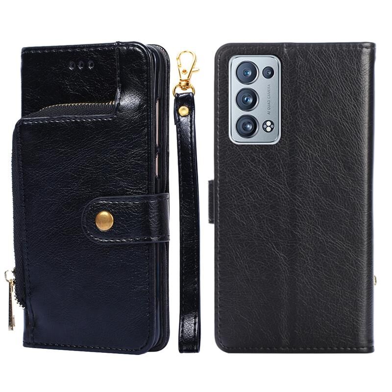 Για OPPO Reno6 Pro + 5G φερμουάρ τσάντα PU + TPU οριζόντια Flip δερμάτινη θήκη με θήκη & υποδοχή κάρτας & πορτοφόλι & κορδόνι (μαύρο)