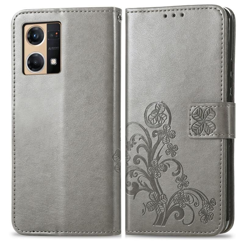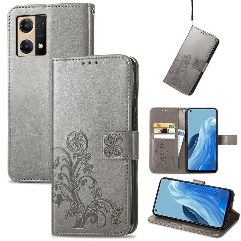 Για OPPO Reno7 4G τετράφυλλο κούμπωμα ανάγλυφο αγκράφα δερμάτινη θήκη τηλεφώνου (γκρι)