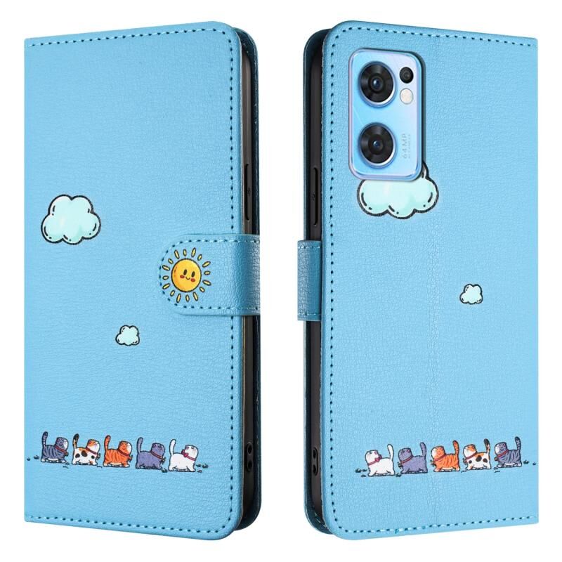Θήκη τηλεφώνου από δέρμα με σχέδια χαριτωμένων γατών για OPPO Reno7 5G / Find X5 Lite (Μπλε)