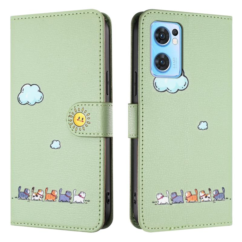 For OPPO Reno7 5G / Find X5 Lite Cartoon Cats Leather Phone Case(Green)