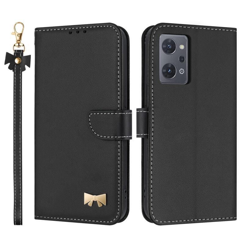 For OPPO Reno7 A / Reno9 A Metal Bow Leather Phone Case with Hand Strap(Black)