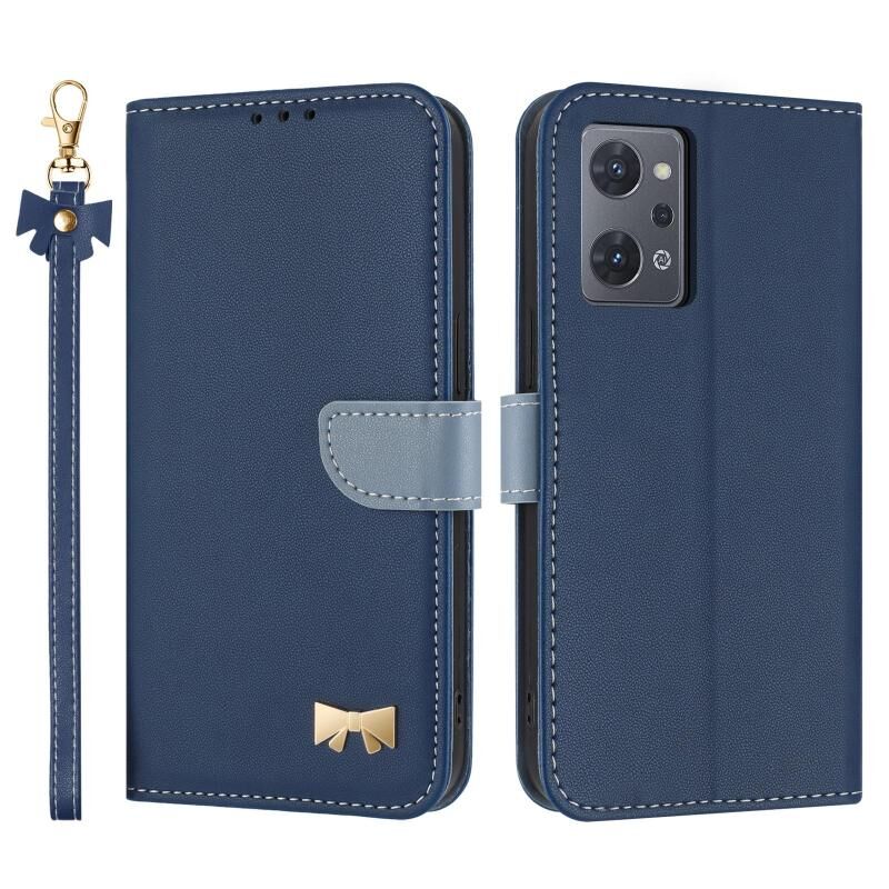 For OPPO Reno7 A / Reno9 A Metal Bow Leather Phone Case with Hand Strap(Dark Blue)