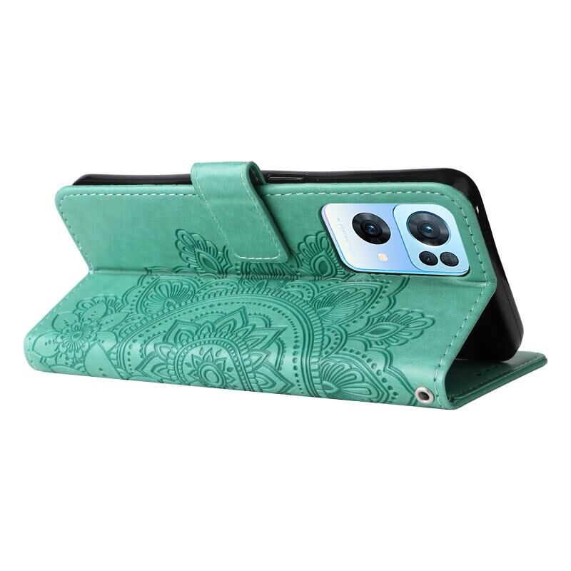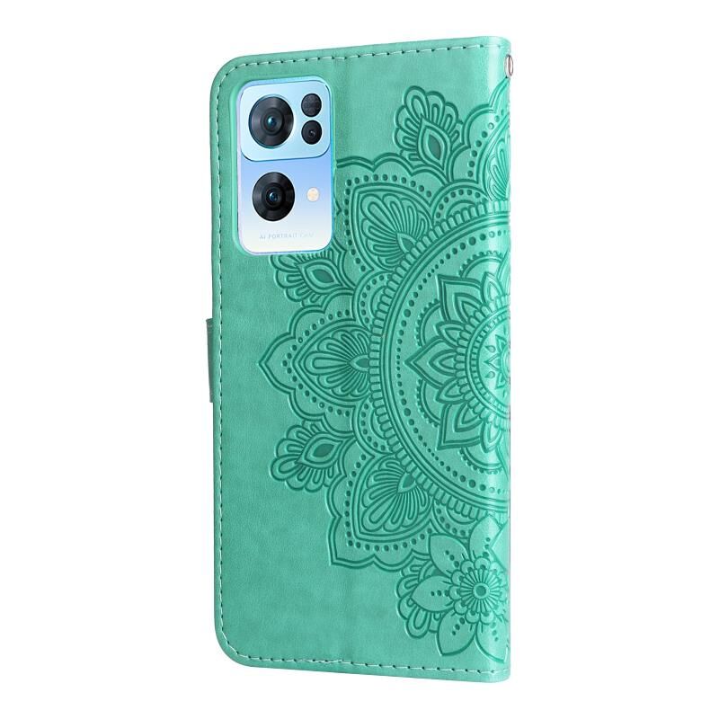 Για OPPO Reno7 Pro 5G 7-πέταλο λουλούδια ανάγλυφο Flip υπόθεση τηλεφώνου δέρμα (πράσινο)