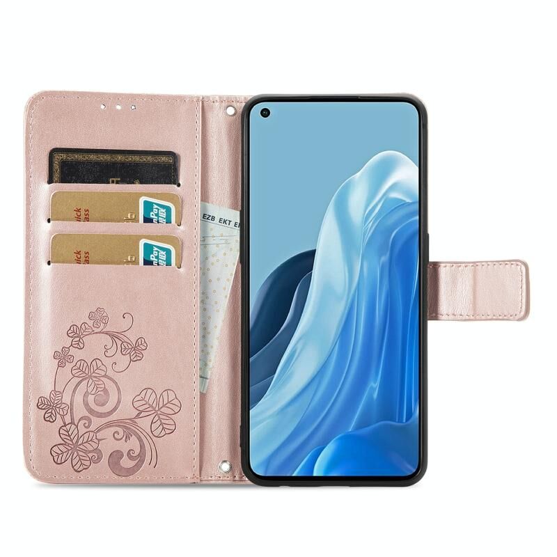 Για OPPO Reno7 Pro 5G τετράφυλλο κούμπωμα ανάγλυφο πόρπη δερμάτινη θήκη τηλεφώνου (Rose Gold)