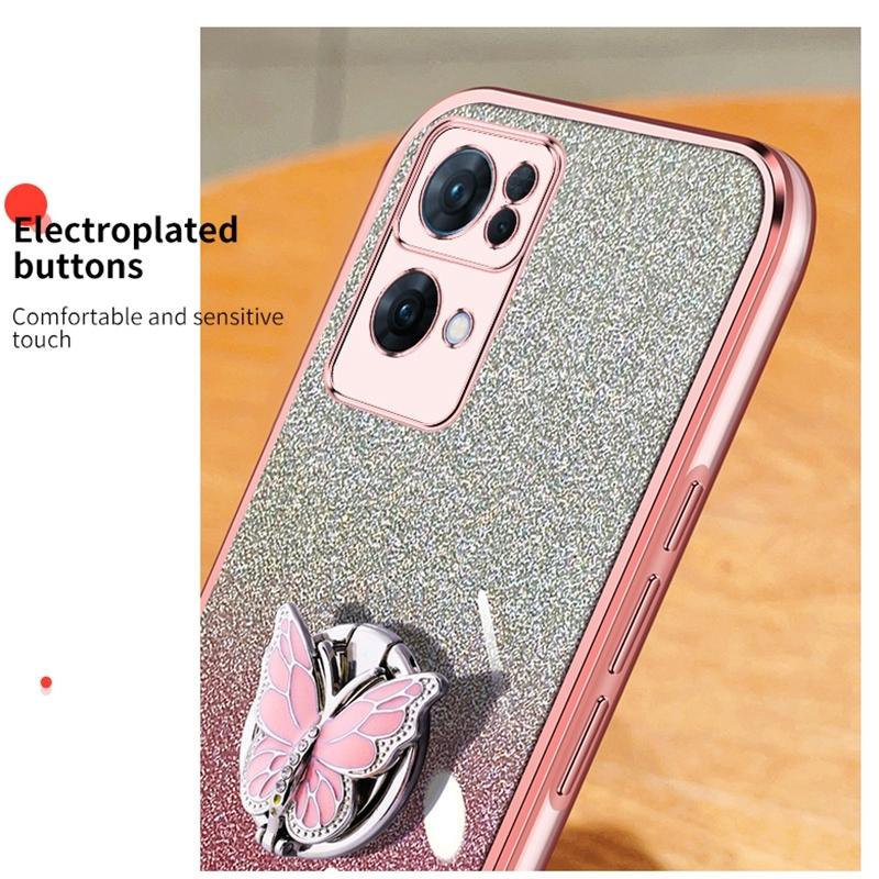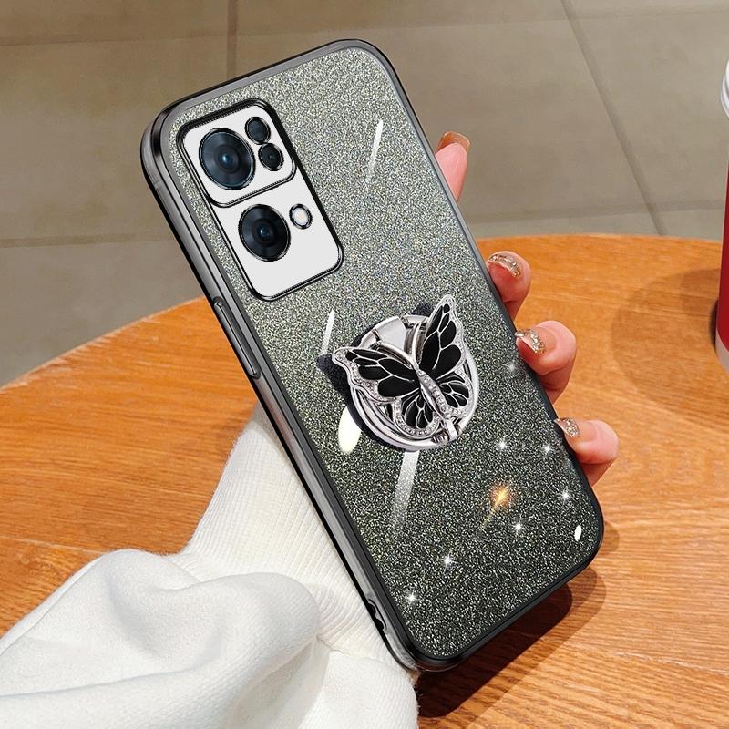 For OPPO Reno7 Pro Plated Gradient Glitter Butterfly Holder TPU Phone Case(Black)