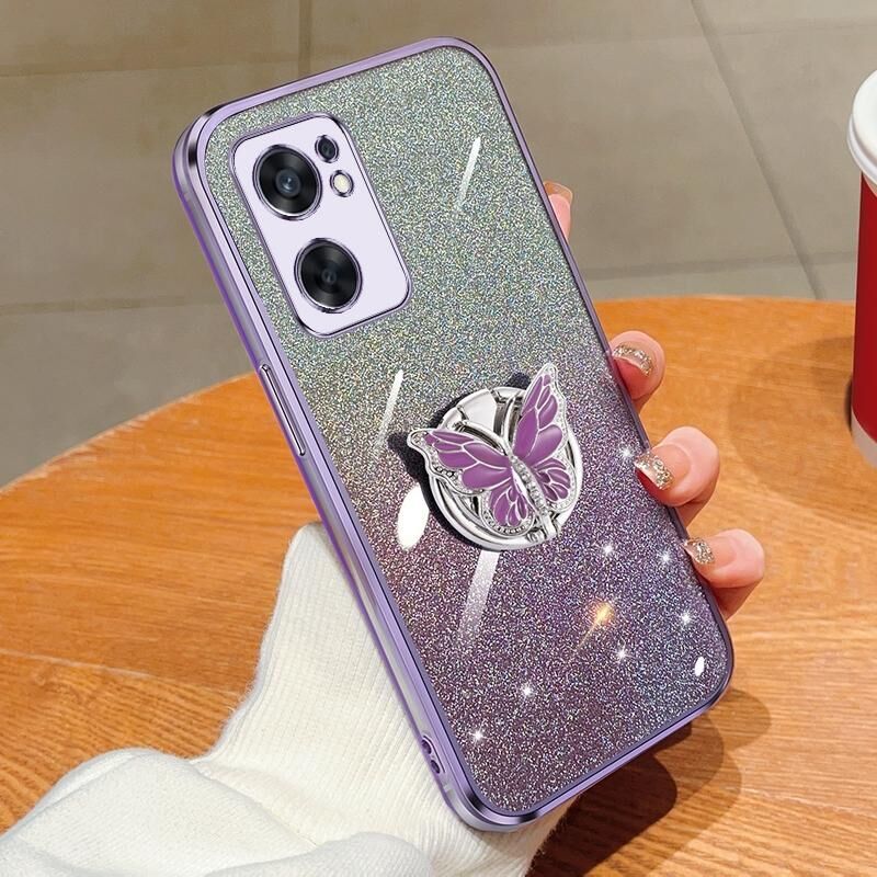 Θήκη τηλεφώνου TPU με σχέδιο πεταλούδας από γκλίτερ και διαβαθμισμένο χρώμα για OPPO Reno7 SE (Ροζ)