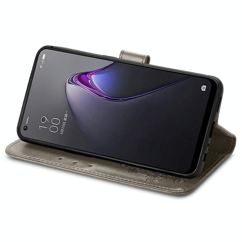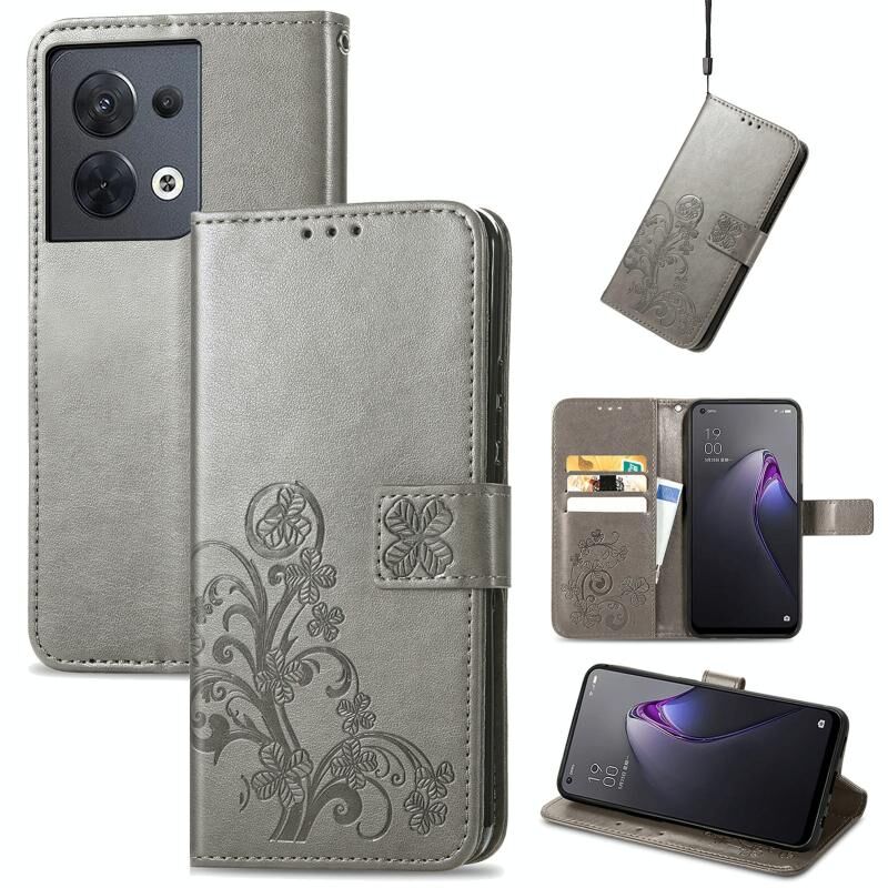 Για OPPO Reno8 5G τετράφυλλο κούμπωμα ανάγλυφο αγκράφα δερμάτινη θήκη τηλεφώνου (γκρι)