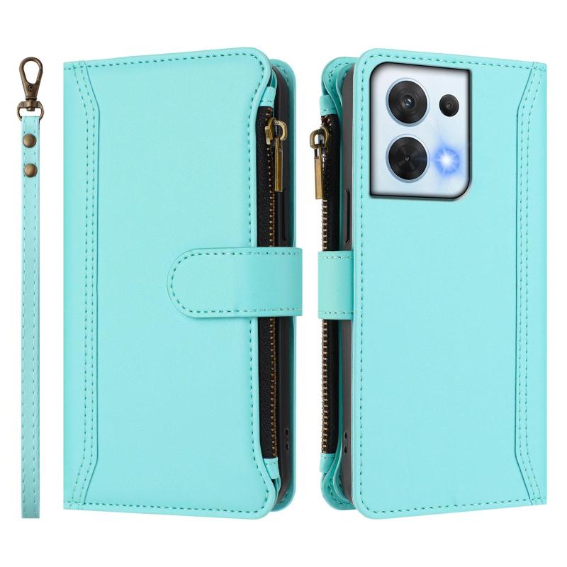 For OPPO Reno8 5G Global Magnetic Closure 9 Card Slots Zipper Leather Case with Hand Strap(Mint Green)