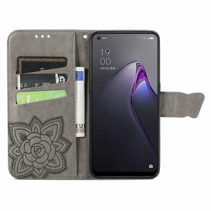 Θήκη τηλεφώνου από δέρμα με ανάγλυφο σχέδιο πεταλούδας και λουλουδιών για OPPO Reno8 (Μαύρο)