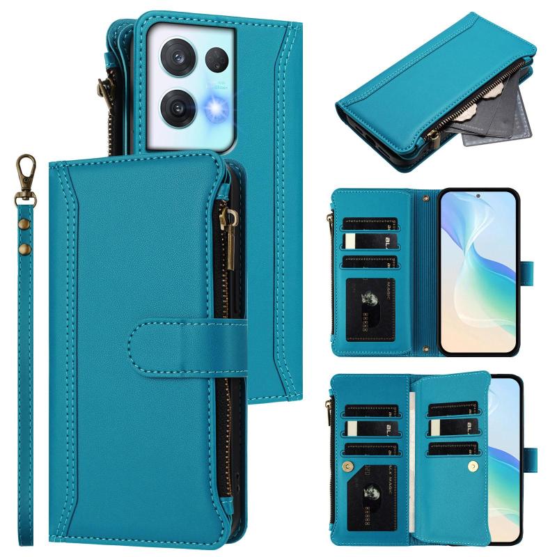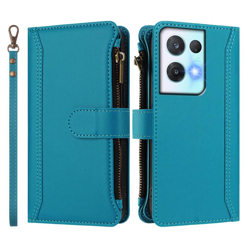 For OPPO Reno8 Pro 5G Magnetic Closure 9 Card Slots Zipper Leather Case with Hand Strap(Turquoise)