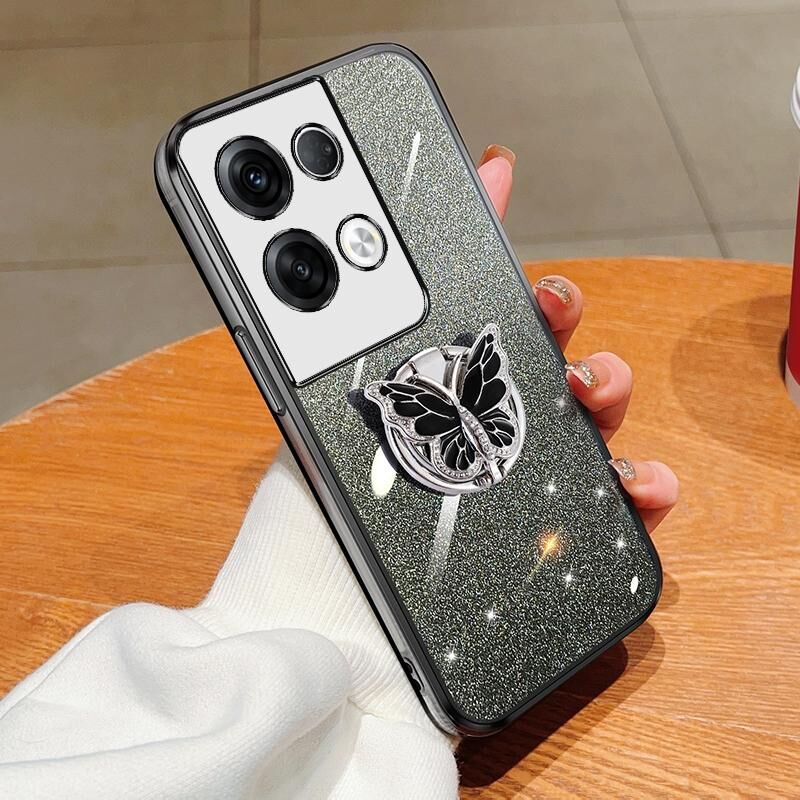 Θήκη κινητού τηλεφώνου OPPO Reno8 Pro+ με επιμετάλλωση, διαβαθμισμένη λάμψη, πεταλούδα (Ροζ)