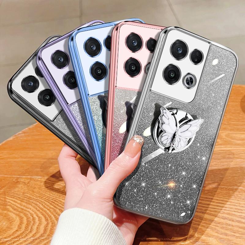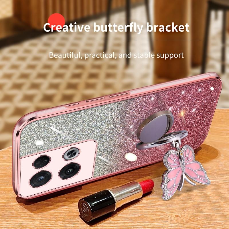 For OPPO Reno8 Pro Plated Gradient Glitter Butterfly Holder TPU Phone Case(Pink)