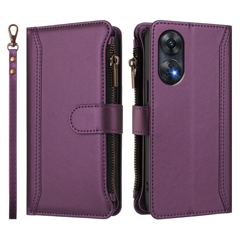 For OPPO Reno8 T 4G Magnetic Closure 9 Card Slots Zipper Leather Case with Hand Strap(Purple)