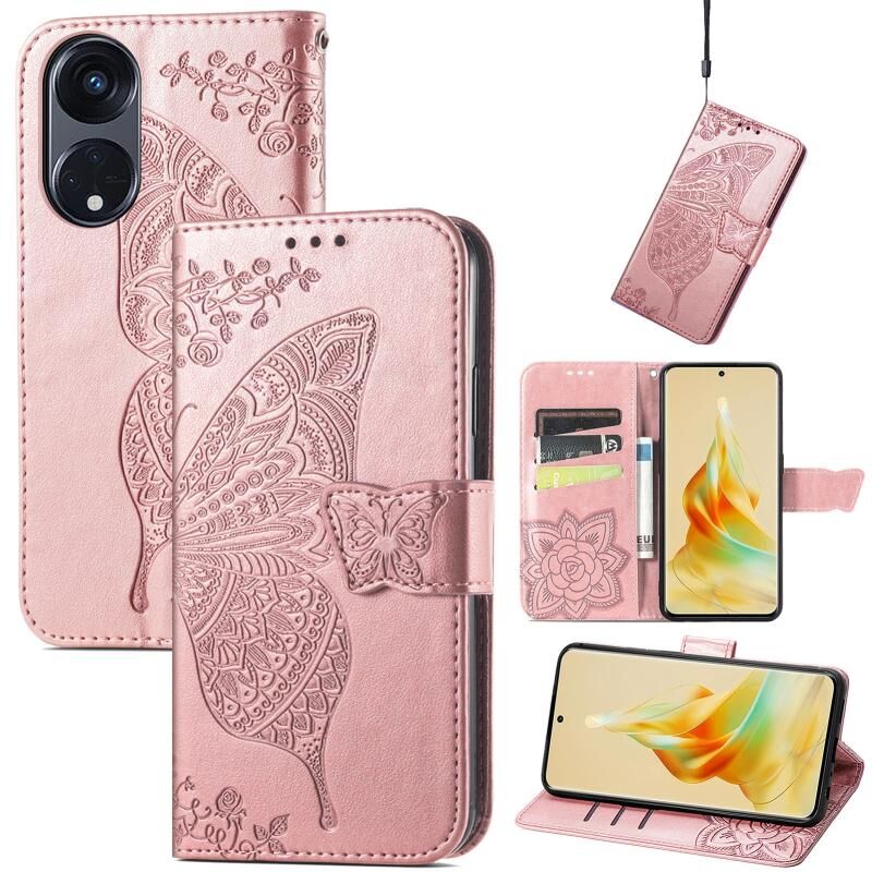 Θήκη τηλεφώνου από δέρμα με ανάγλυφο σχέδιο πεταλούδας και λουλουδιών για OPPO Reno8 T 5G (Ροζ χρυσός)