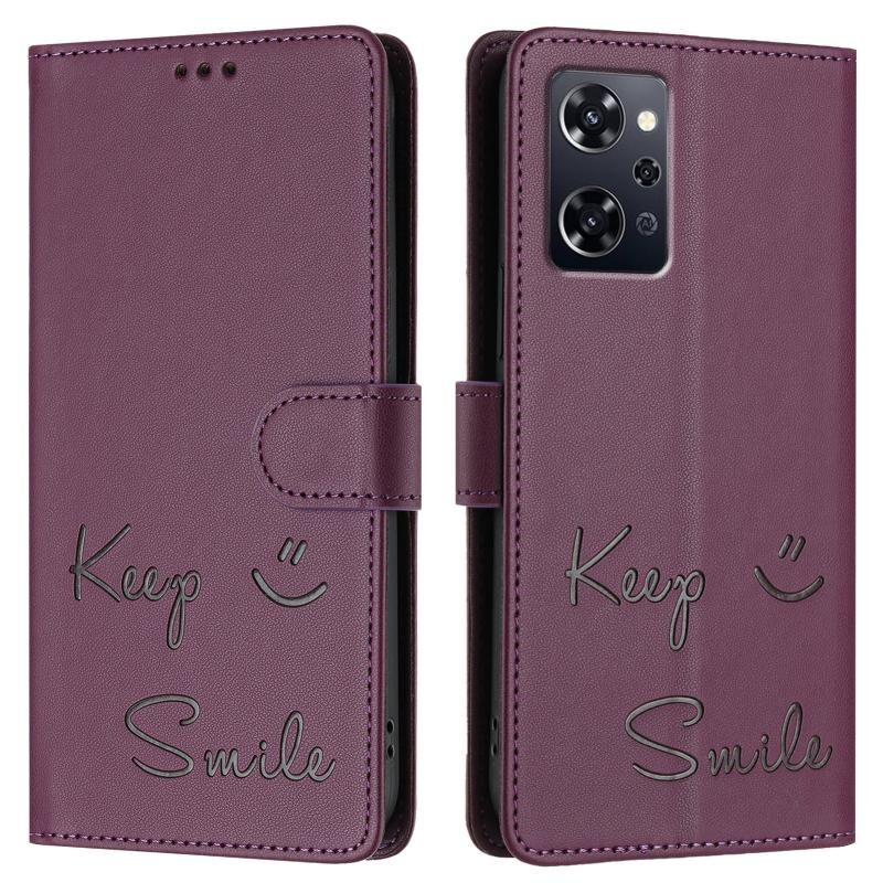 Για OPPO Reno9 Ένα χαμόγελο ανάγλυφο RFID δερμάτινη θήκη τηλεφώνου (Violet)