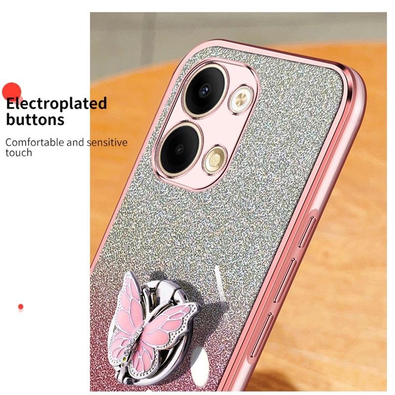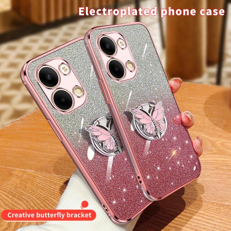 For OPPO Reno9 Plated Gradient Glitter Butterfly Holder TPU Phone Case(Sierra Blue)